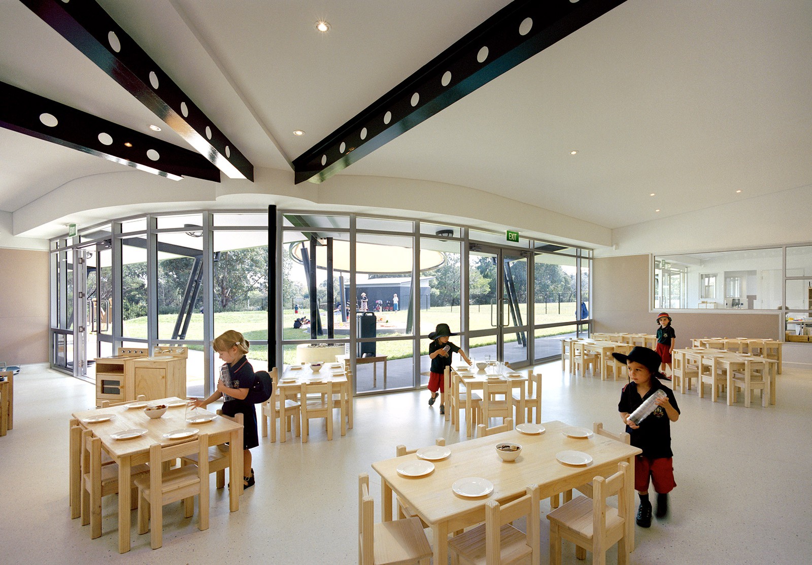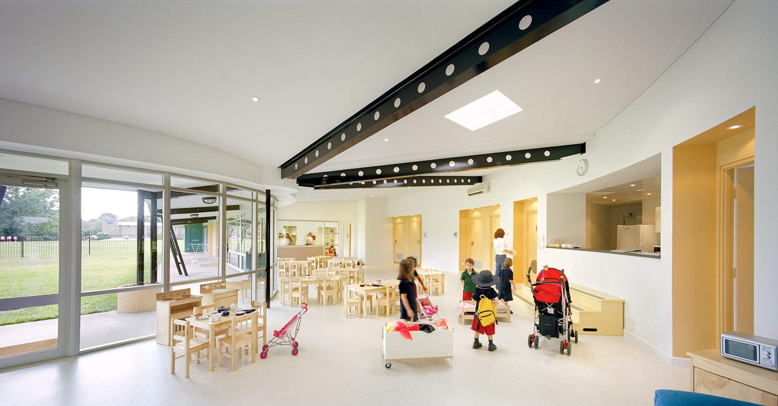 This building reflects the aims of the program — it’s creative, welcoming and uses interesting shapes and spaces. The ‘classroom’ spaces and a strong connection with the outdoors. Natural light and air are central to the Reggio Emilia approach. The quality of light in some areas can change for sleeping and light is used extensively to create effects essential to the design.