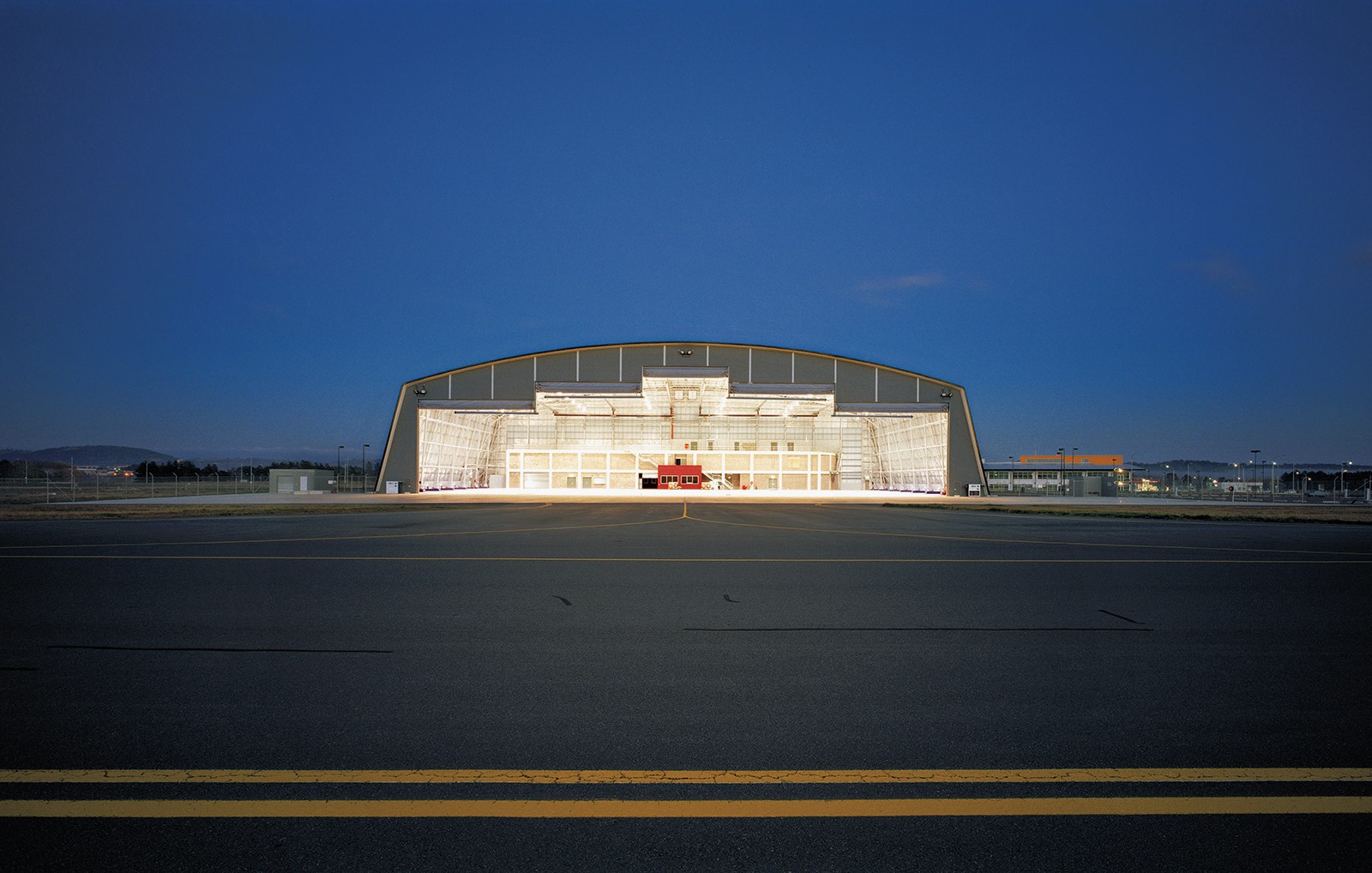 The apron area facilitates the manoeuvring of aircraft in and out of the adjacent hangar in addition to providing additional space for aircraft service and overnight parking. The hangar is a light weight steel and rod structure that provides a clear span of 85 metres to fit two Boeing 737-800s or three 717-200s or one Boeing 767. In addition to the Aircraft hangar an adjoining maintenance support annex is provided, which comprises of stores, engineering support and administration.